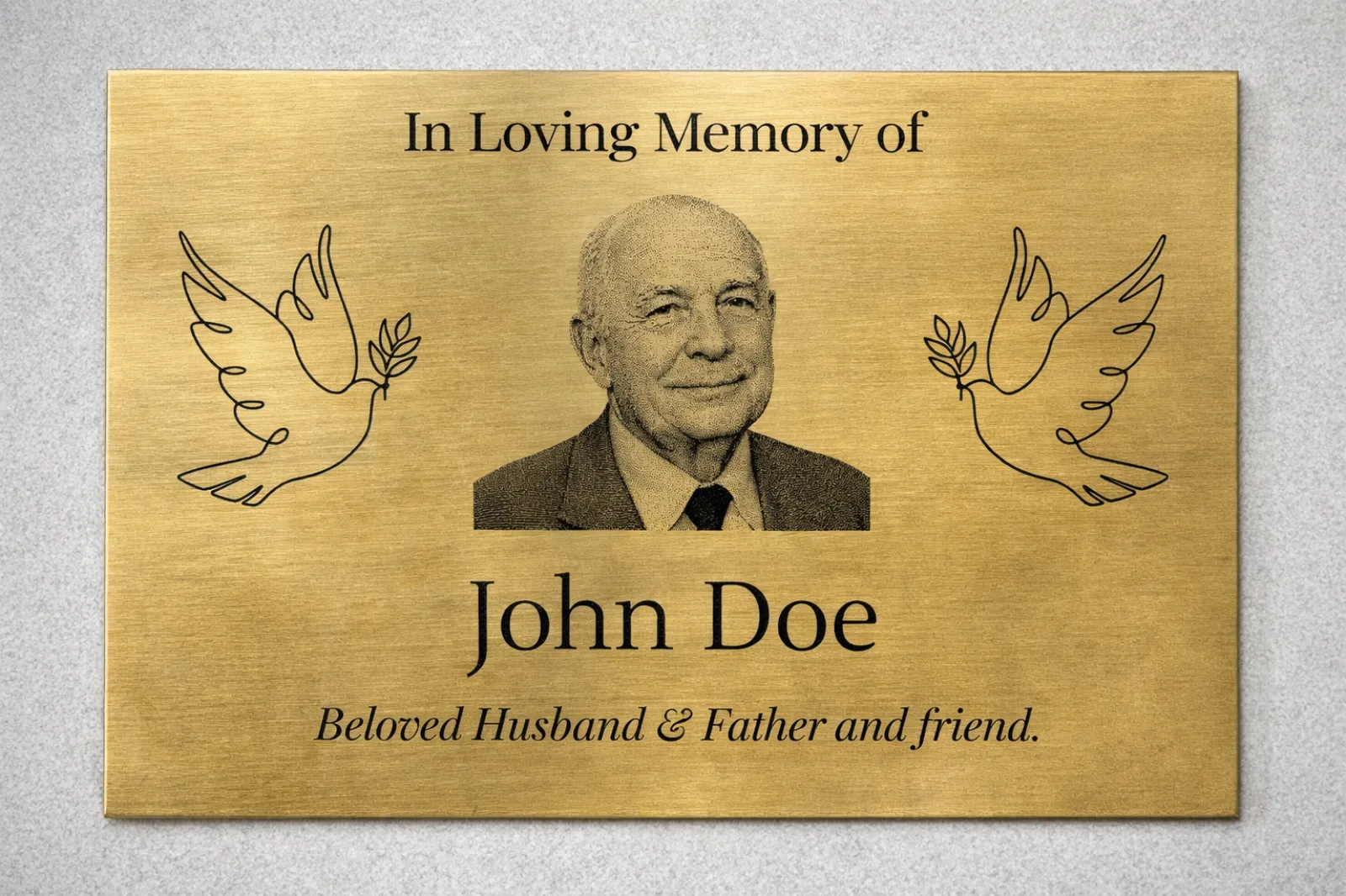 The image and text are permanently engraved into the metal, creating a refined and lasting tribute suitable for memorial halls, institutions, or family spaces.